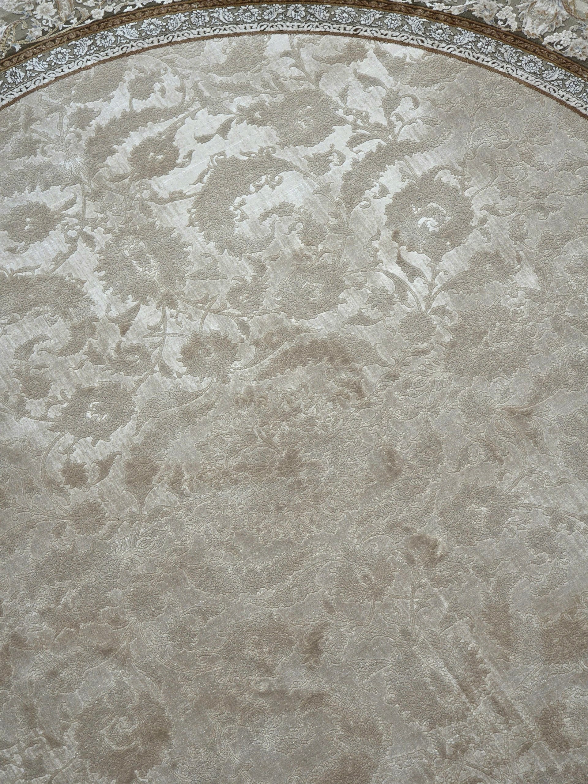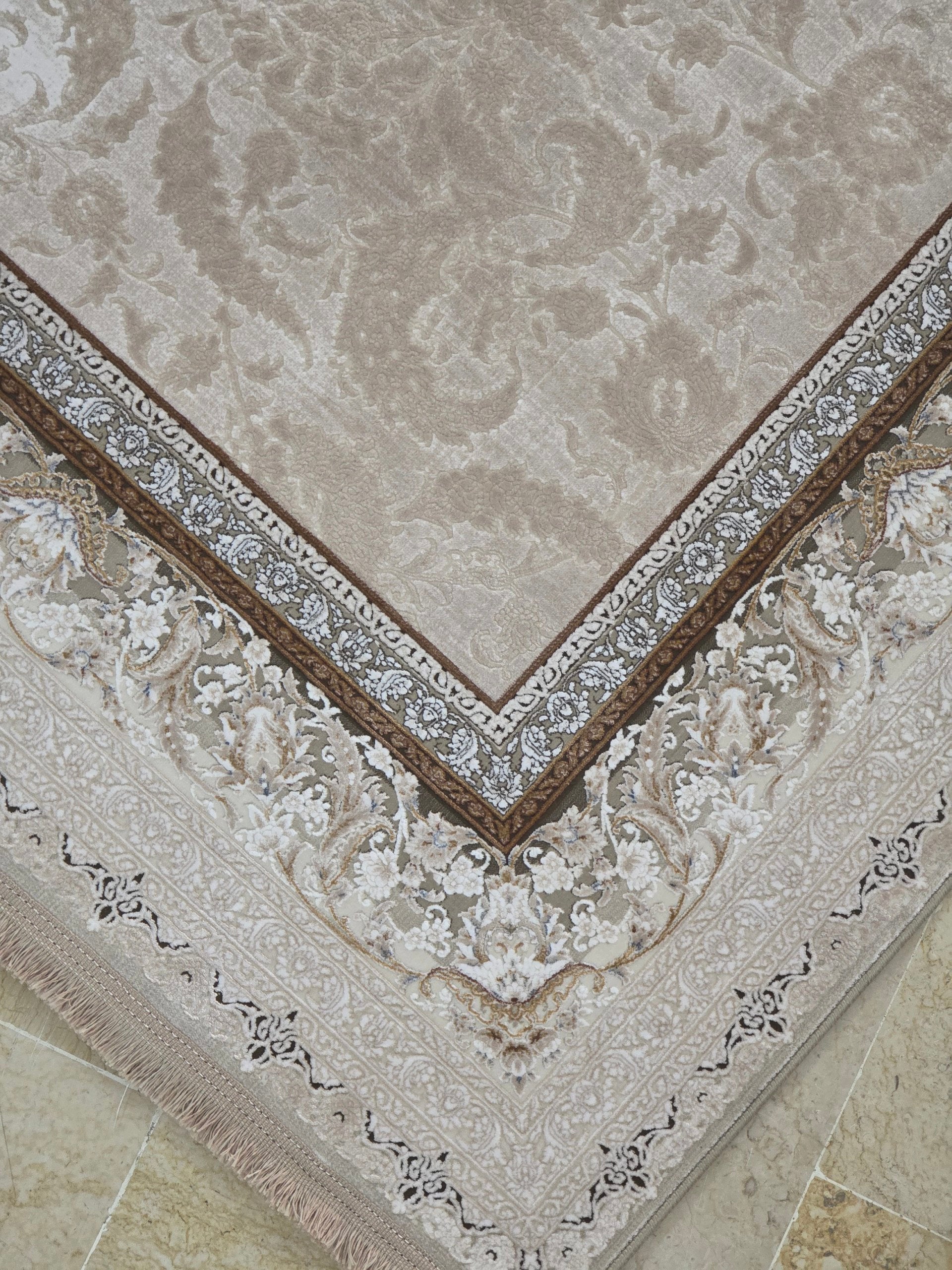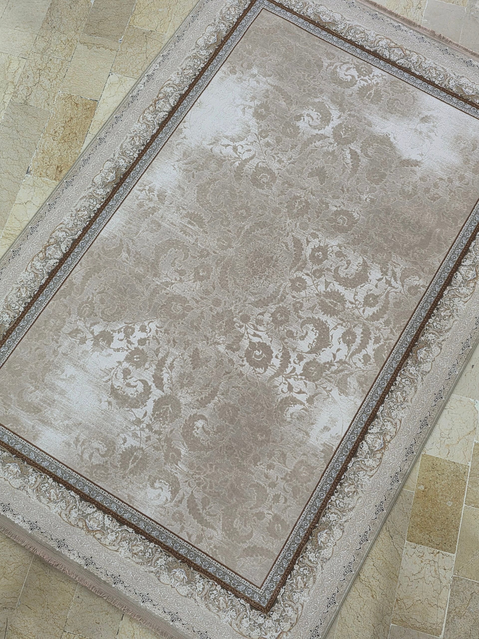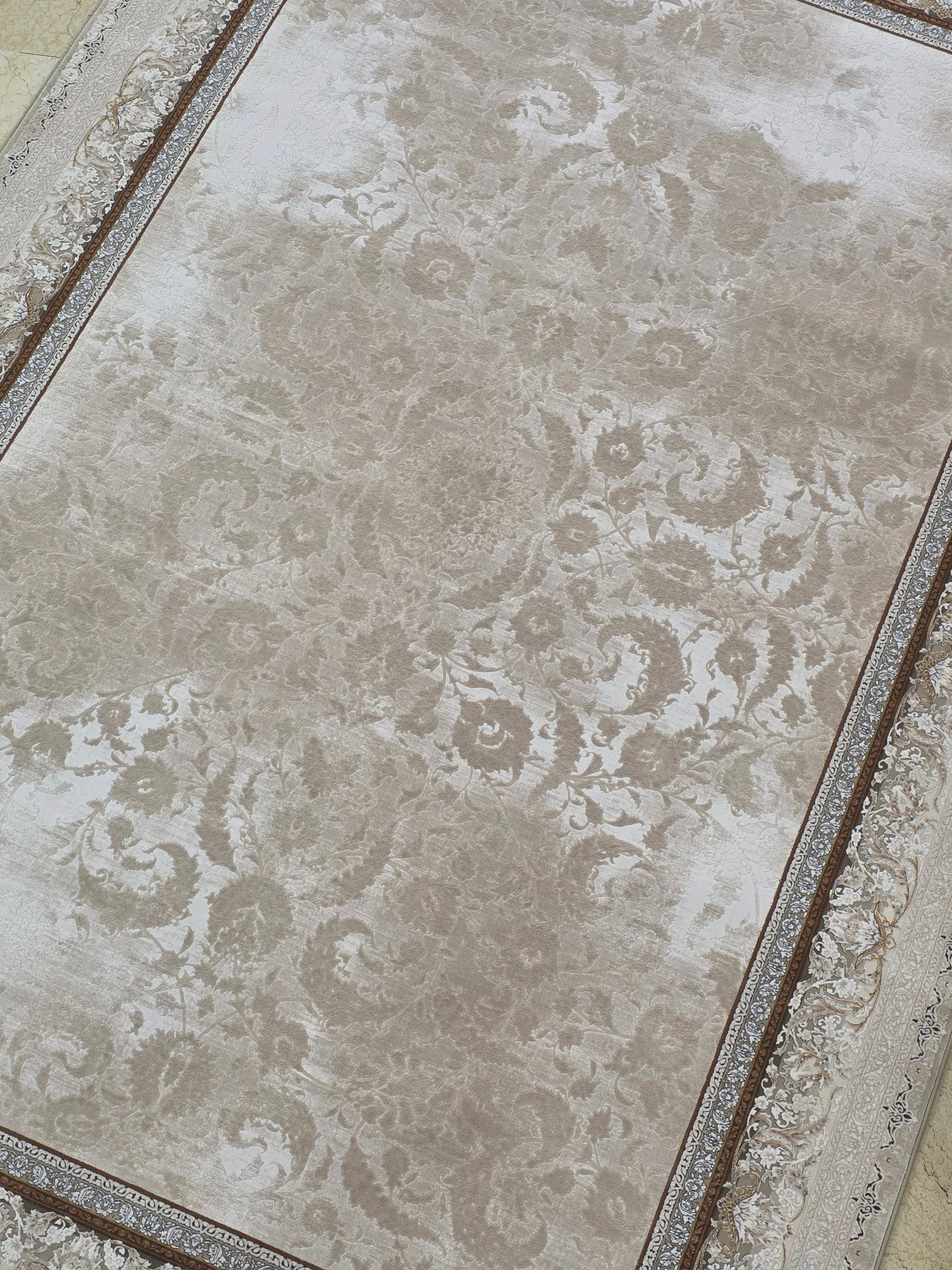 “Desert Blossom” captures timeless sophistication with its soft beige field and graceful tone-on-tone floral motifs. The delicate patterns shimmer subtly in changing light, offering both depth and refinement. A finely detailed double border — framed in warm brown and cream with arabesque flourishes — adds balance and distinction to the design.
